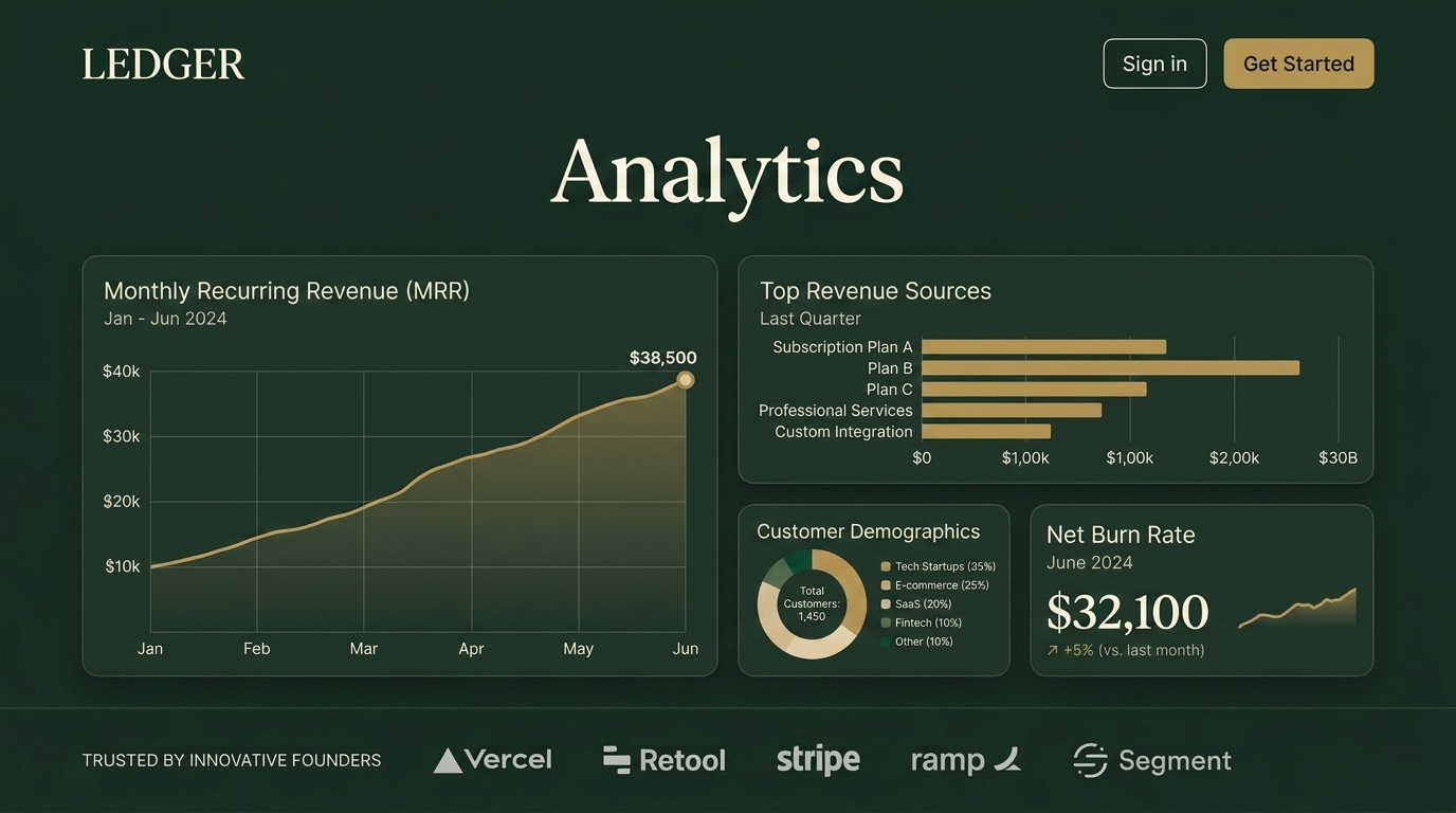 The image displays a financial analytics dashboard for Ledger, showcasing monthly recurring revenue trends, top revenue sources, customer demographics, and net burn rate for June 2024.