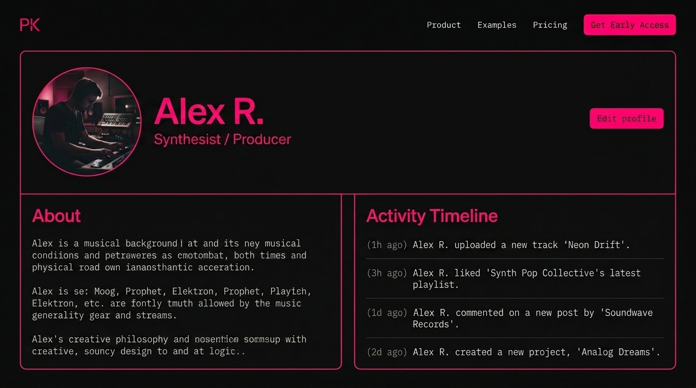 This image showcases the profile of Alex R., a synthesist and producer, detailing his background, philosophy, and recent activities in music production.
