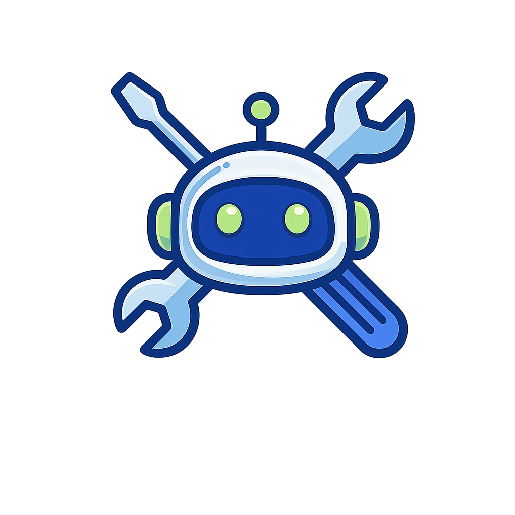 A vibrant cartoon-style robot character with large green eyes, flanked by a wrench and a screwdriver, symbolizing technology and repair.