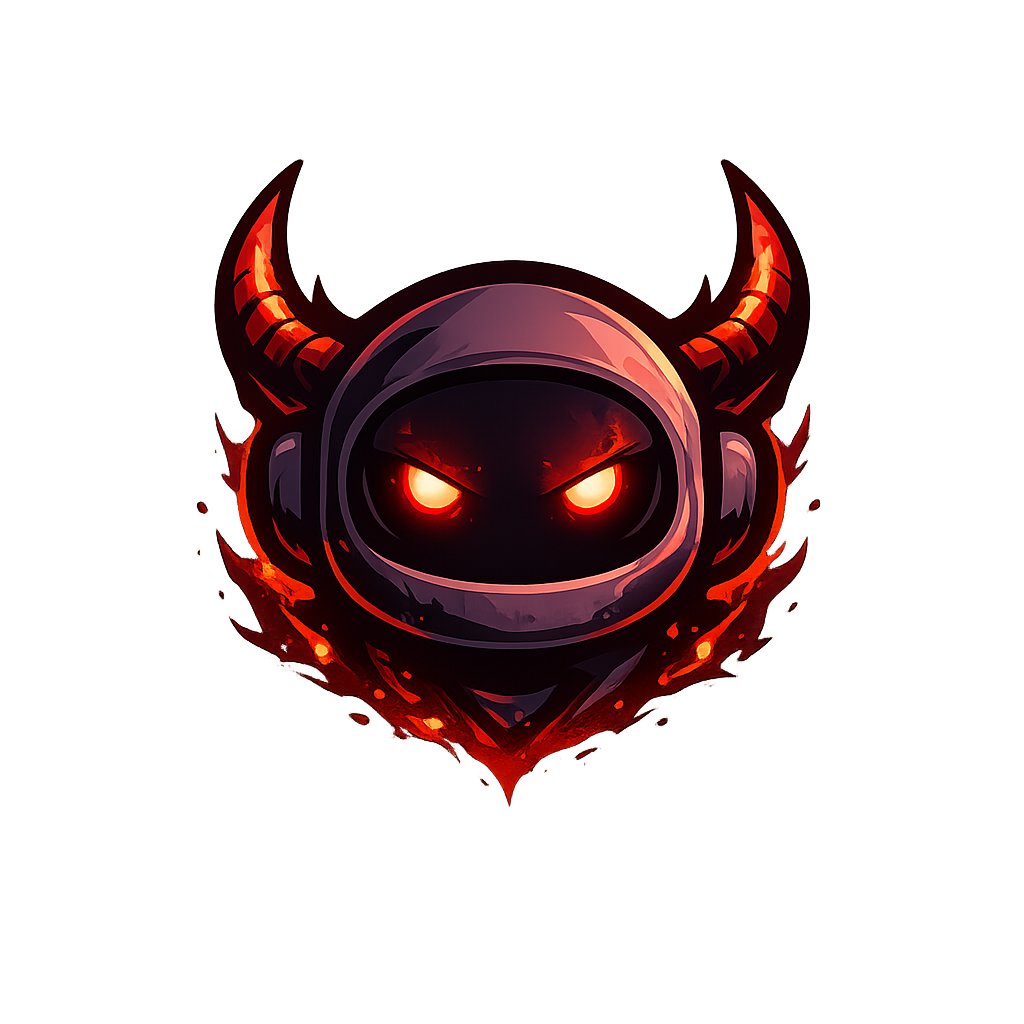 A striking cartoon-style ninja character features glowing red eyes and prominent horns, set against a warm gradient background. The design exudes a fierce and intense vibe.