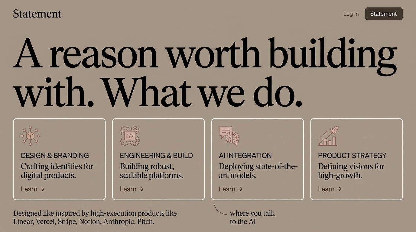 This image showcases a modern web design layout highlighting various services including branding, engineering, AI integration, and product strategy, aimed at high-growth solutions.