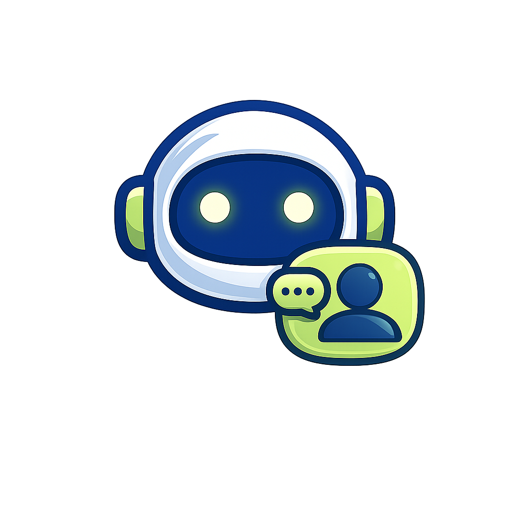 A playful robot character featuring a blue and white design with glowing eyes. It holds a green chat bubble, symbolizing communication and interaction.