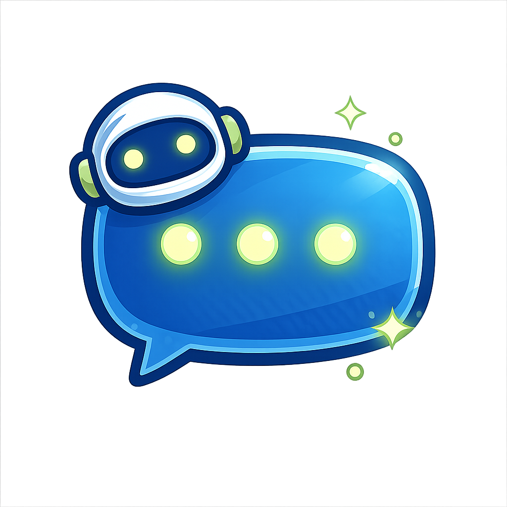 A vibrant blue chat bubble with a friendly robot character on top. The bubble features three glowing dots, symbolizing conversation, with sparkling effects in the background.