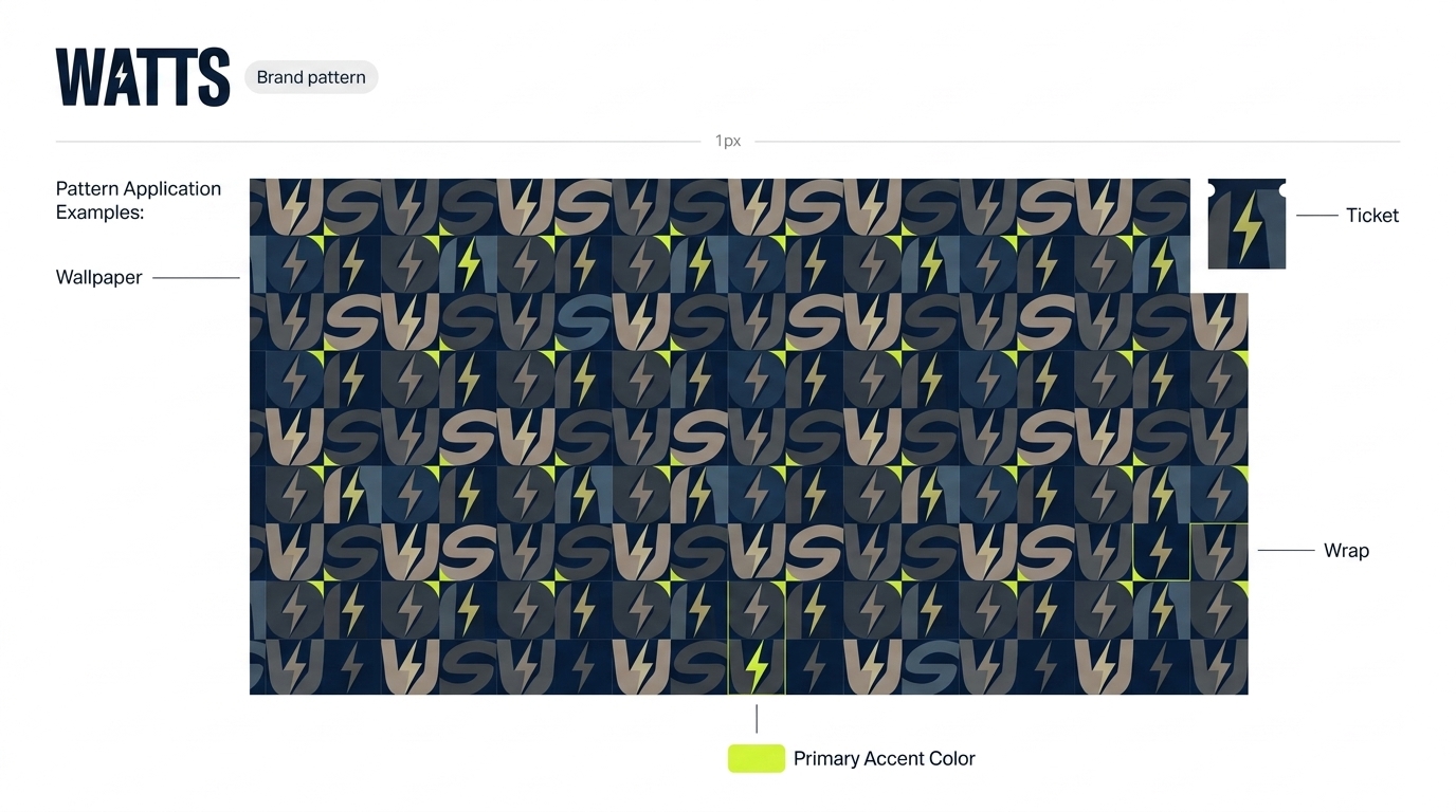 This image showcases the brand pattern for Watts, featuring a repeated design of lightning bolts and the text 'VS' on a dark background. It includes applications for tickets, wallpaper, and wraps, along with the primary accent color highlighted.