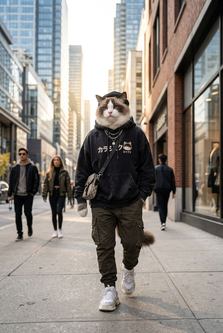 An anthropomorphic ragdoll cat in trendy streetwear outfit, posing in a modern urban city street with tall buildings, casual and cool expression, professional lifestyle photography, sunny day