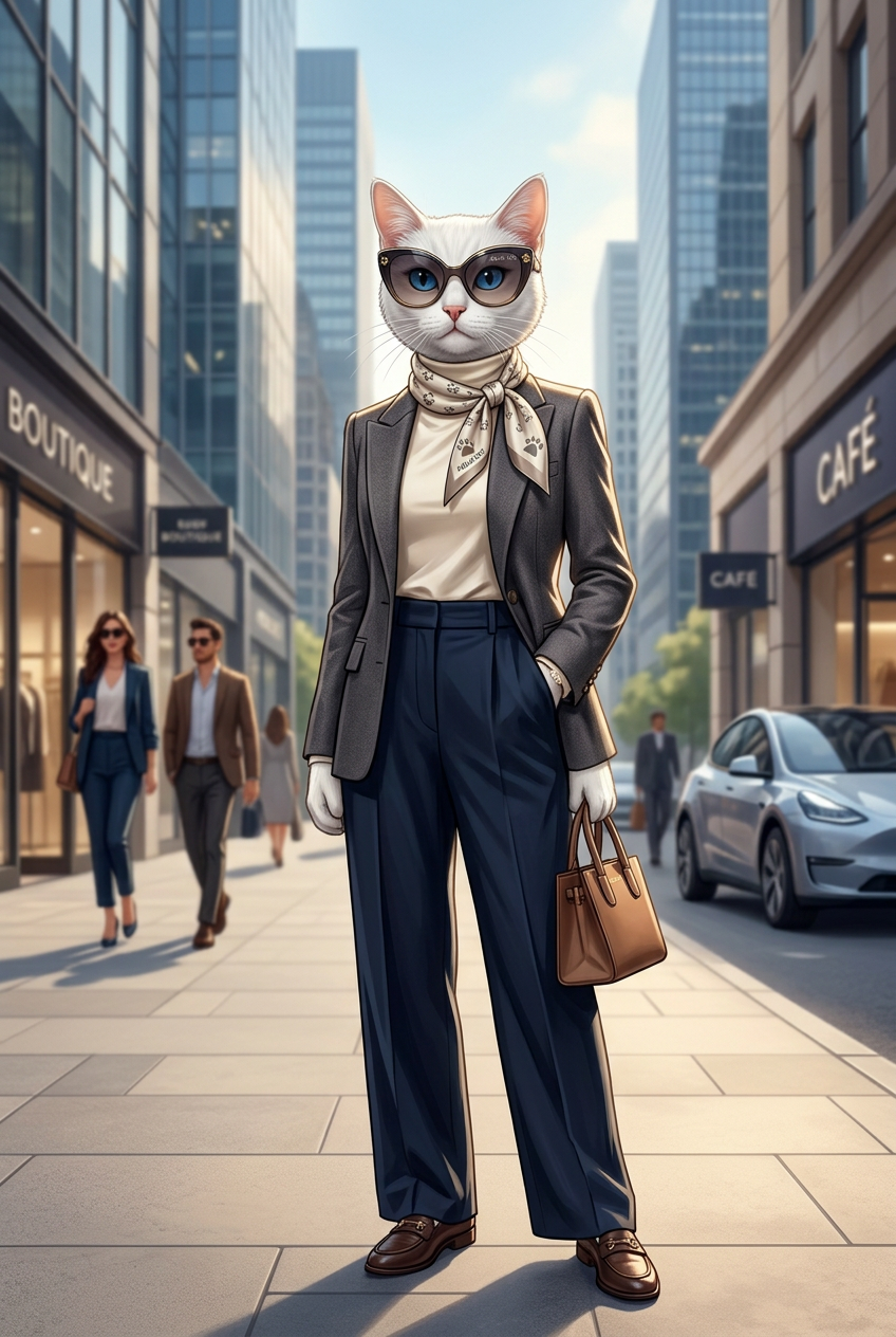 Anthropomorphic white cat in a chic urban outfit, designer sunglasses and fashionable clothing, standing on a city street with modern buildings in background, professional fashion photography, influencer aesthetic, high quality digital illustration