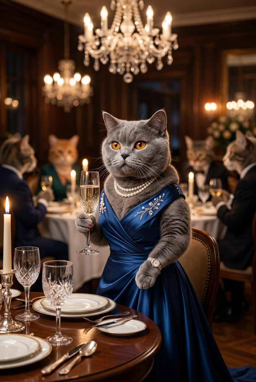 anthropomorphic british shorthair cat in elegant formal evening gown, attending an upscale dinner party, sophisticated atmosphere with candlelit restaurant, elegant pose, glamorous mood, refined setting