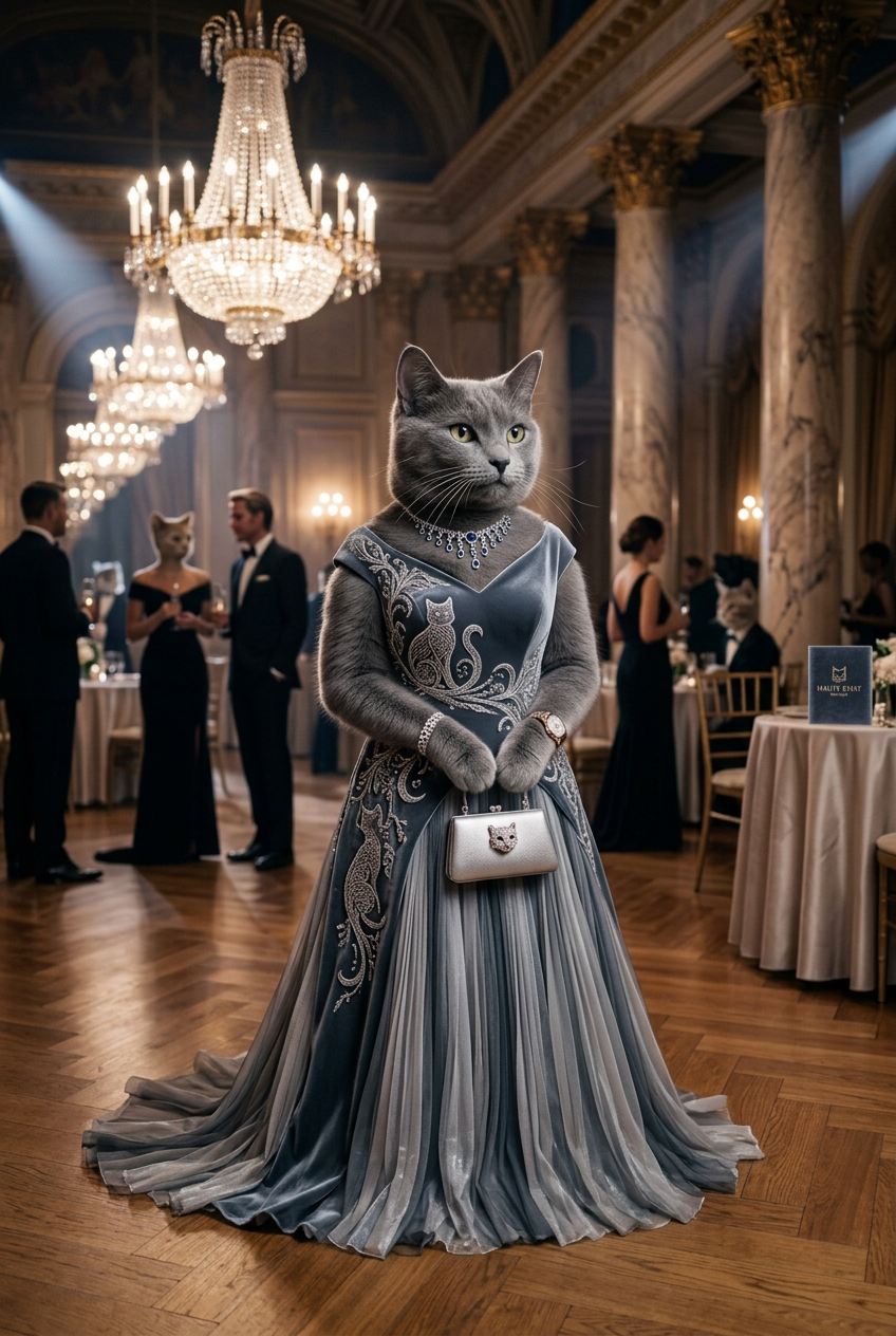 An anthropomorphic gray cat in an exquisite haute couture gown at an exclusive gala event, grand ballroom with chandeliers and marble columns in background, luxury evening wear, refined glamour aesthetic, dramatic theatrical lighting, detailed fashion photography