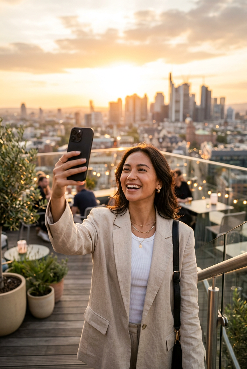 stylish woman in her 20s taking a selfie at a rooftop cafe during golden hour, warm soft light, minimalist aesthetic, modern urban setting, clean composition, professional photography