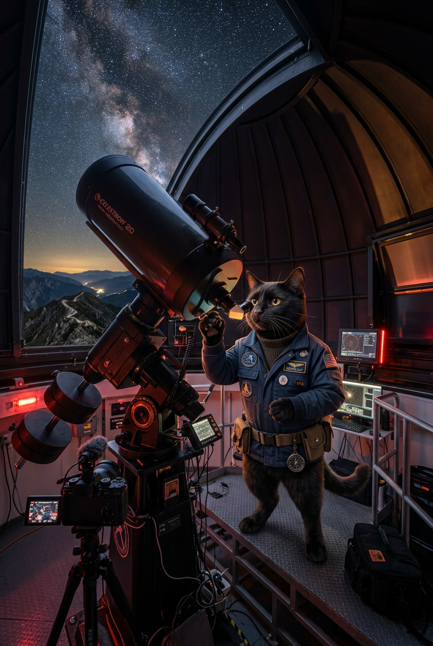 An anthropomorphic black cat in an astronomer's outfit, peering through a massive telescope at a mountaintop observatory, stargazing influencer, professional photography, cinematic lighting