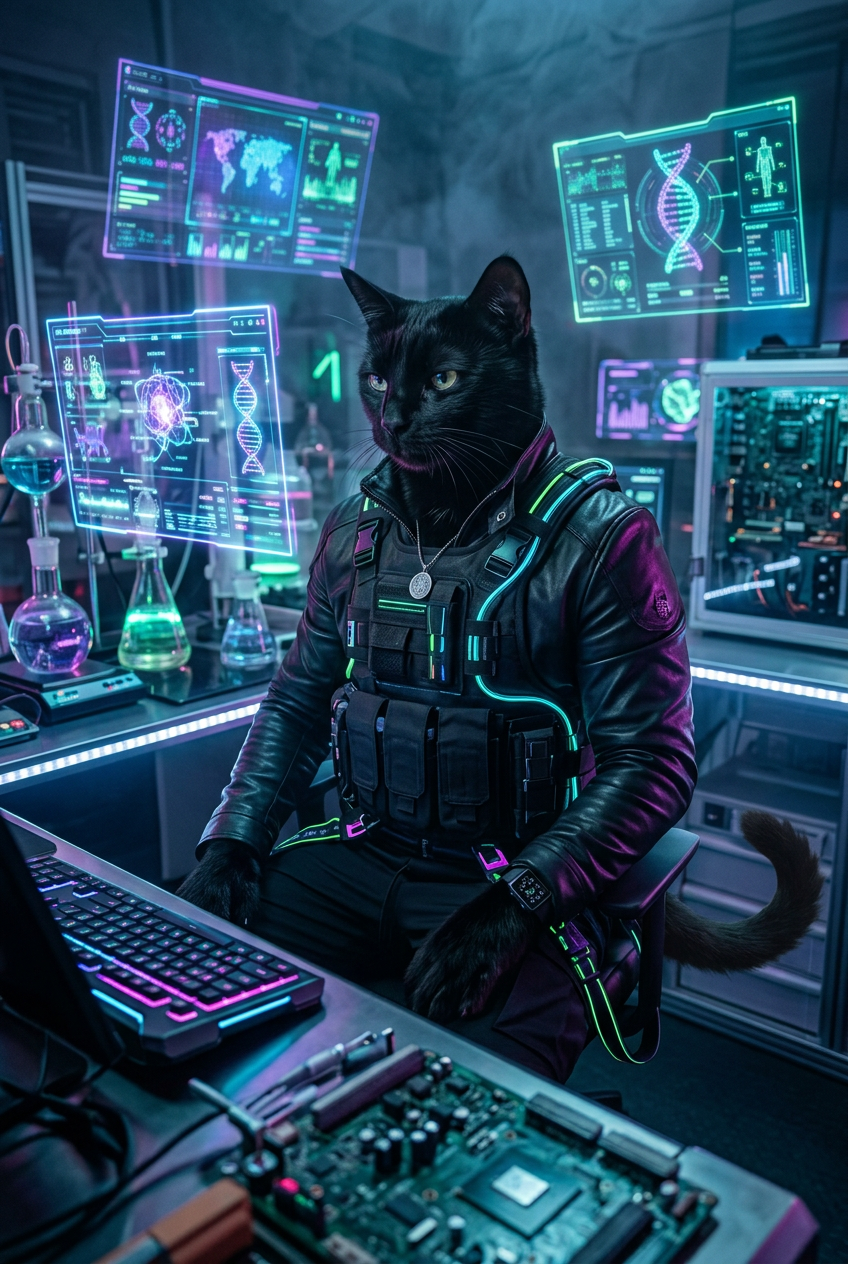 Anthropomorphic black cat in tech wear - black leather jacket, tactical vest, neon accents - sitting in a high-tech laboratory with holographic displays and neon lights, cyberpunk biohacker aesthetic, moody atmospheric lighting
