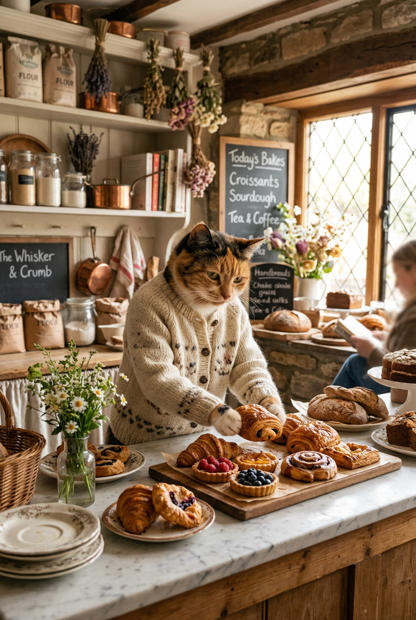 An anthropomorphic calico cat in a cozy knit cardigan, carefully arranging fresh pastries on a marble counter in a charming cottagecore bakery, warm natural lighting, soft aesthetic, food blogger vibes