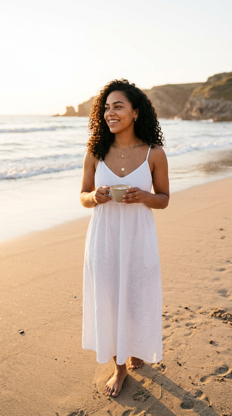 Young woman with curly dark hair and light brown skin, wearing a flowing linen dress at a golden-hour beach sunset, barefoot in the sand, ocean waves in background, golden hour lighting, lifestyle photography