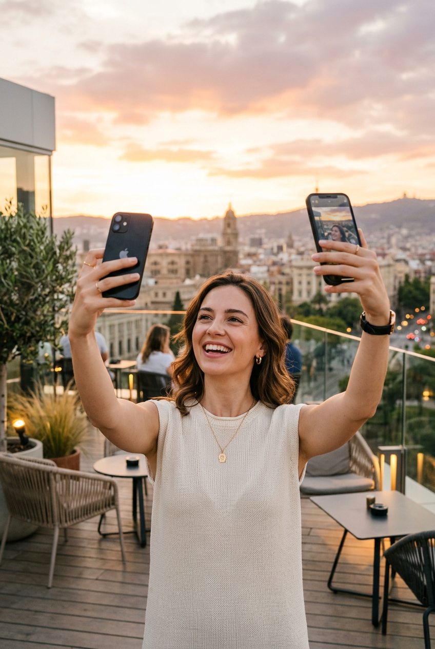Stylish woman in her 20s taking a selfie at a rooftop cafe, golden hour lighting, minimalist aesthetic, warm soft light, modern fashion, clean composition
