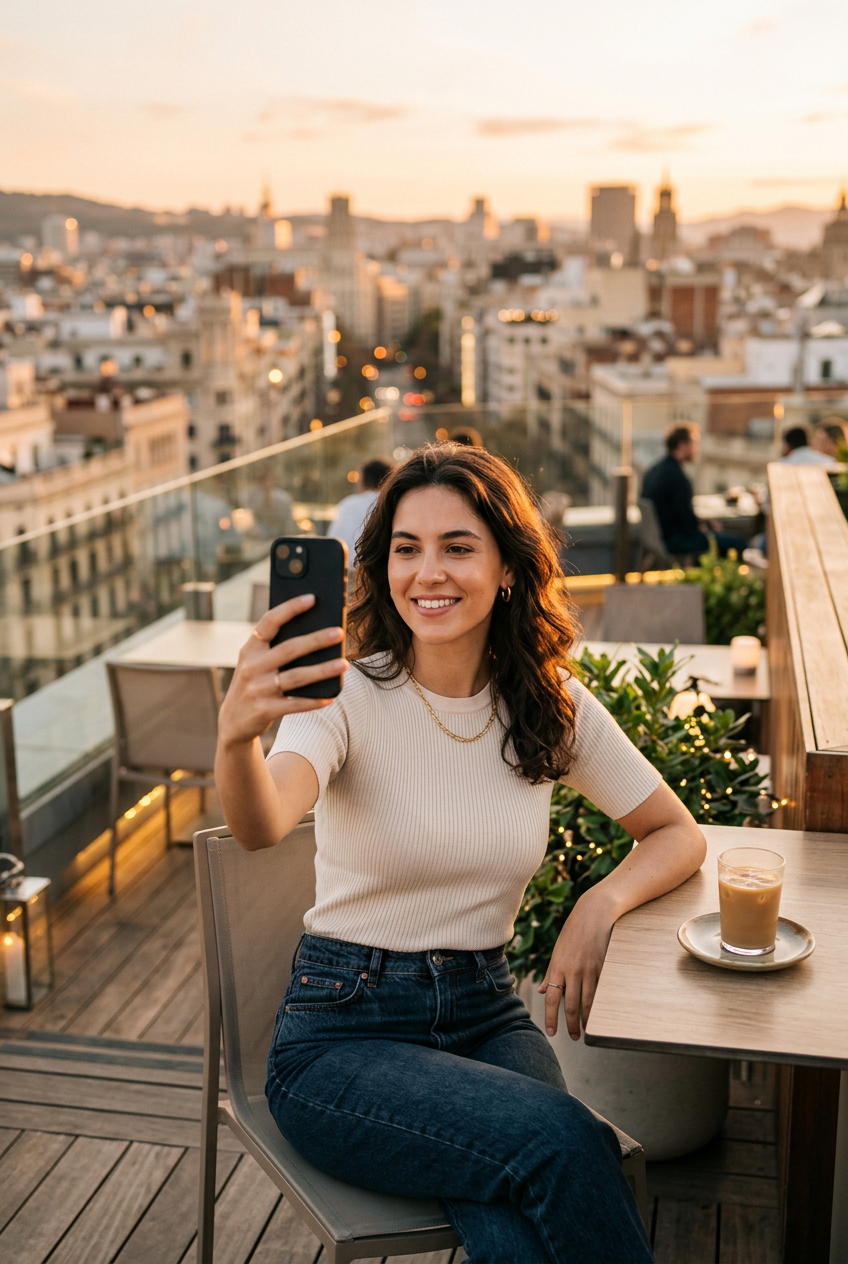stylish woman in her 20s taking a selfie at a rooftop cafe during golden hour, warm soft sunlight, minimalist aesthetic, clean composition, modern fashion, professional photography
