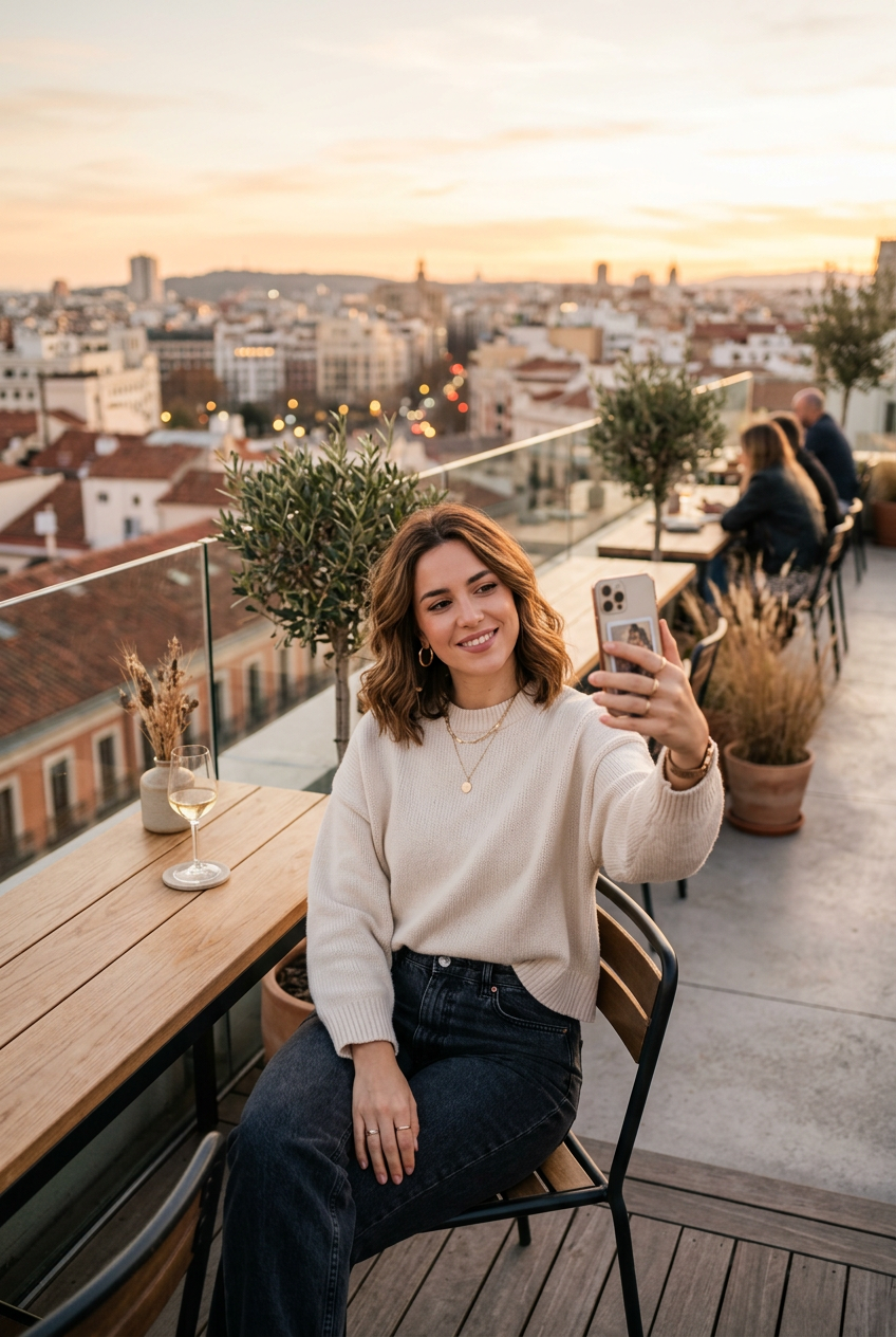 Stylish woman in her 20s taking a selfie at a rooftop cafe during golden hour, warm sunset lighting, minimalist aesthetic, clean modern composition, soft shadows, high fashion casual wear, peaceful urban rooftop setting