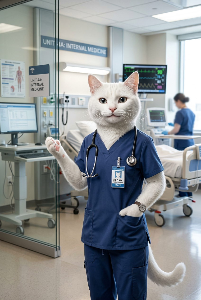 anthropomorphic white cat wearing blue medical scrubs, holding a stethoscope around neck, standing in a modern bright hospital room with medical equipment in background, professional medical influencer pose, confident expression, highly detailed, professional lighting