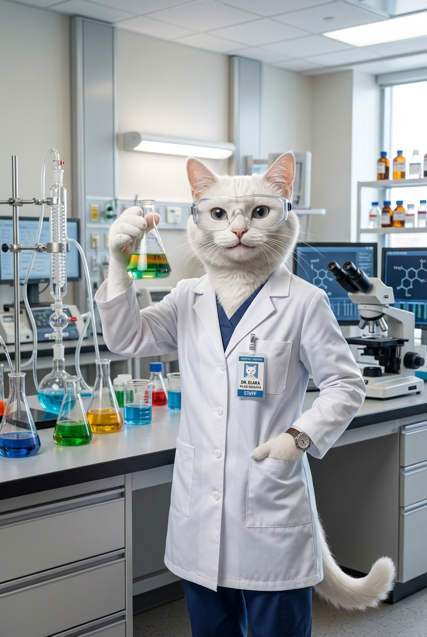 anthropomorphic white cat wearing lab coat and safety goggles, standing in research laboratory with scientific equipment and beakers, analytical pose, professional lighting, detailed