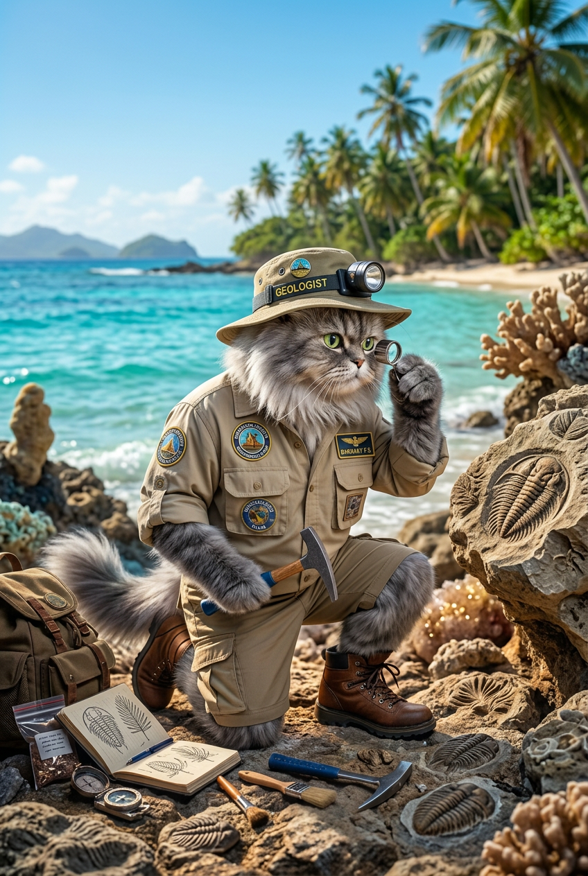 Anthropomorphic Persian cat geologist wearing a tropical field outfit with lightweight khaki shirt, wide-brimmed sun hat, and cargo shorts, examining rock formations and fossils on a sunny beach with ocean waves and palm trees in background, professional paleontology aesthetic, vibrant tropical lighting, cinematic quality