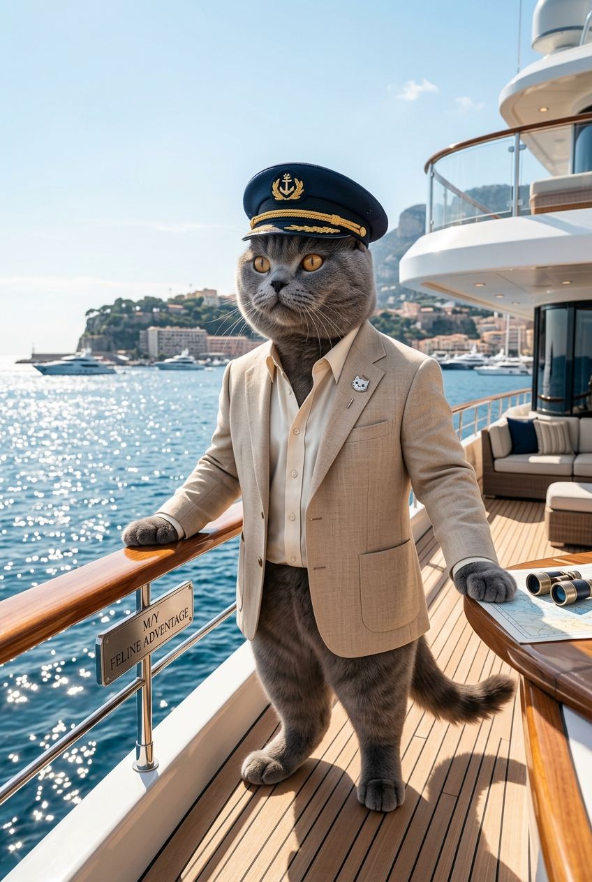 Same anthropomorphic British Shorthair cat CEO character, wearing a sophisticated linen blazer and silk shirt, standing on a luxury yacht deck with sparkling ocean and coastline in the background, captain's hat optional