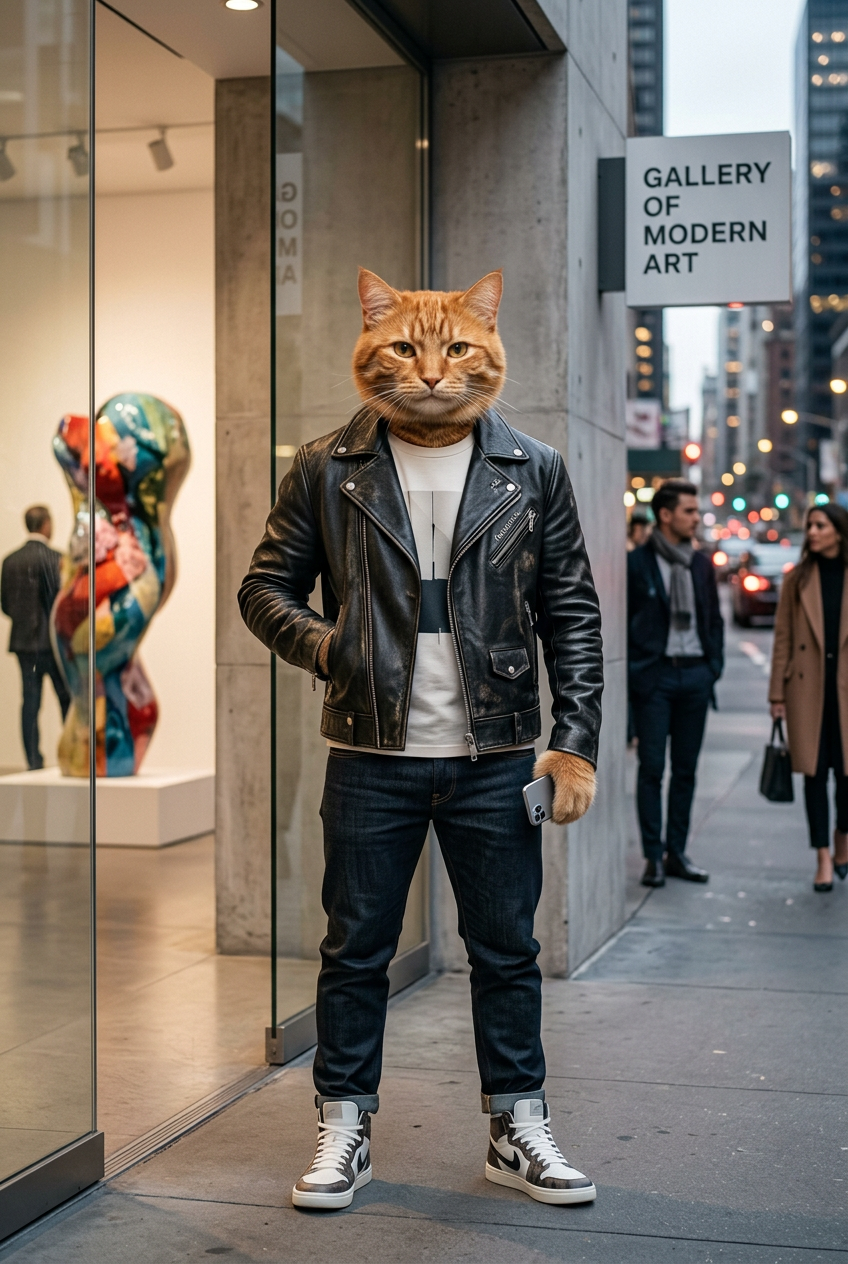 Anthropomorphic ginger cat in a leather jacket and designer streetwear, posing in front of a modern art gallery entrance, urban fashion editorial style, confident stance, professional photography