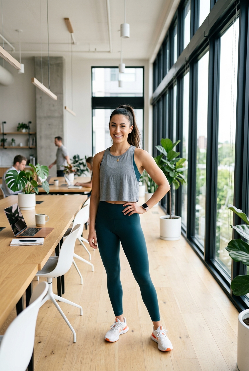 fit woman in athleisure wear at modern minimalist co-working space, natural daylight from windows, bright clean aesthetic, confident pose, contemporary professional environment, daylight photography