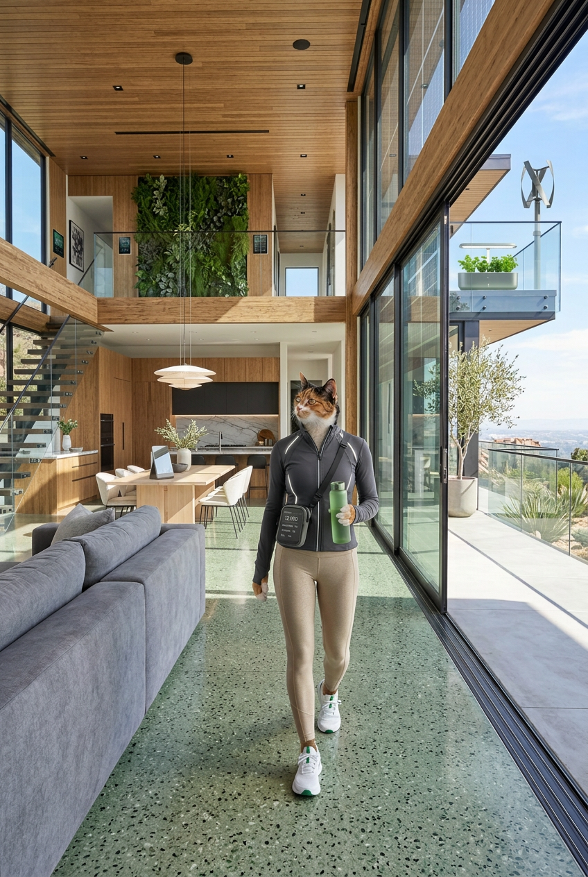 anthropomorphic calico cat wearing stylish athletic wear, posing in a modern smart home with tech features, minimalist eco-friendly sustainable architecture, contemporary green living aesthetic