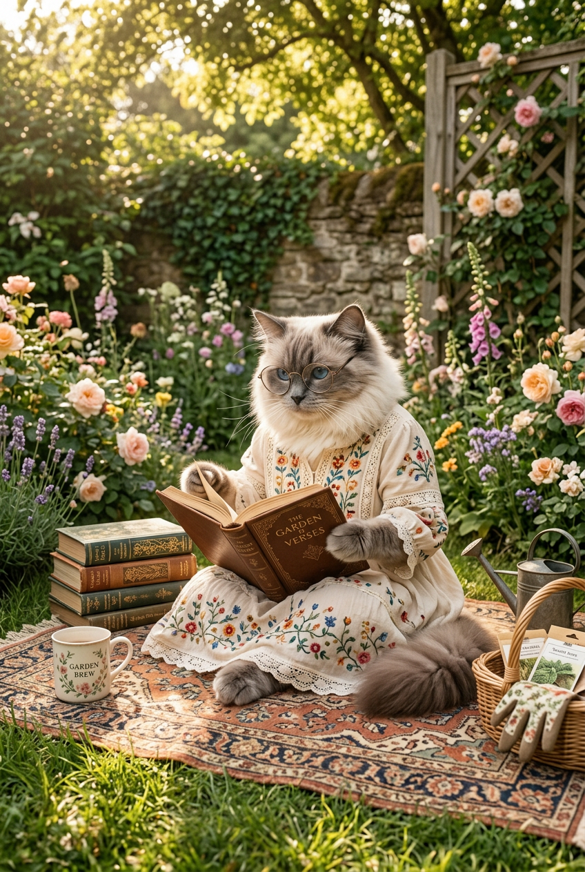Anthropomorphic ragdoll cat in bohemian-style dress with floral patterns, sitting cross-legged in sunlit garden surrounded by flowers and plants, reading poetry, natural soft light, peaceful whimsical atmosphere