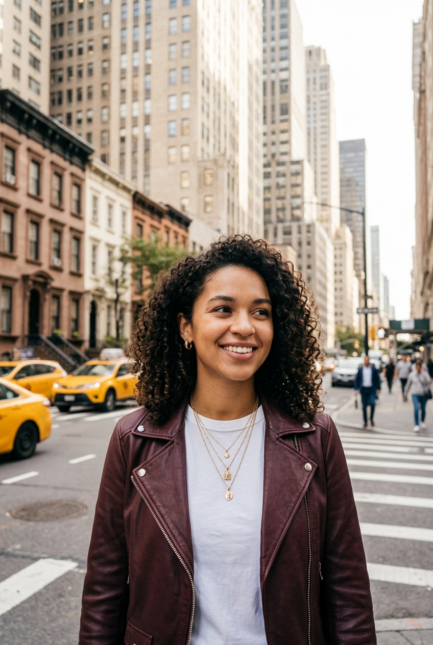 Young woman with curly dark hair, light brown skin, gold layered necklaces, wearing a burgundy leather jacket and white t-shirt, standing on a New York City street with tall buildings behind her, natural daylight, urban fashion lifestyle photo