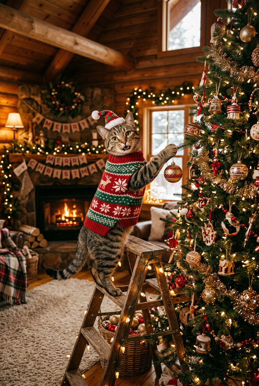An anthropomorphic tabby cat in a cozy Christmas sweater, decorating a huge Christmas tree in a warm cabin, holiday content creator style, warm lighting, festive and cozy atmosphere