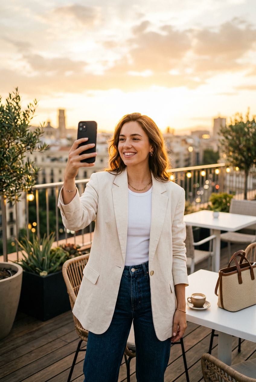 stylish woman in her 20s taking a selfie at a rooftop cafe during golden hour, warm sunset lighting, minimalist aesthetic, clean composition, soft bokeh background, casual chic outfit, relaxed pose, modern cafe setting with potted plants, high quality fashion photography