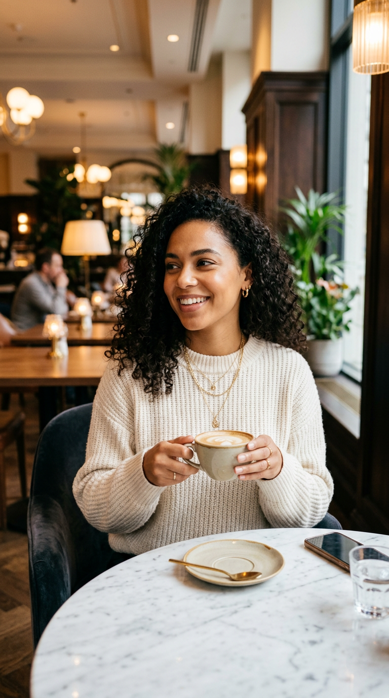 Young woman with curly dark hair, light brown skin, gold layered necklaces, cream knit sweater, sitting at marble table with a latte, upscale hotel cafe, warm lighting, lifestyle photo