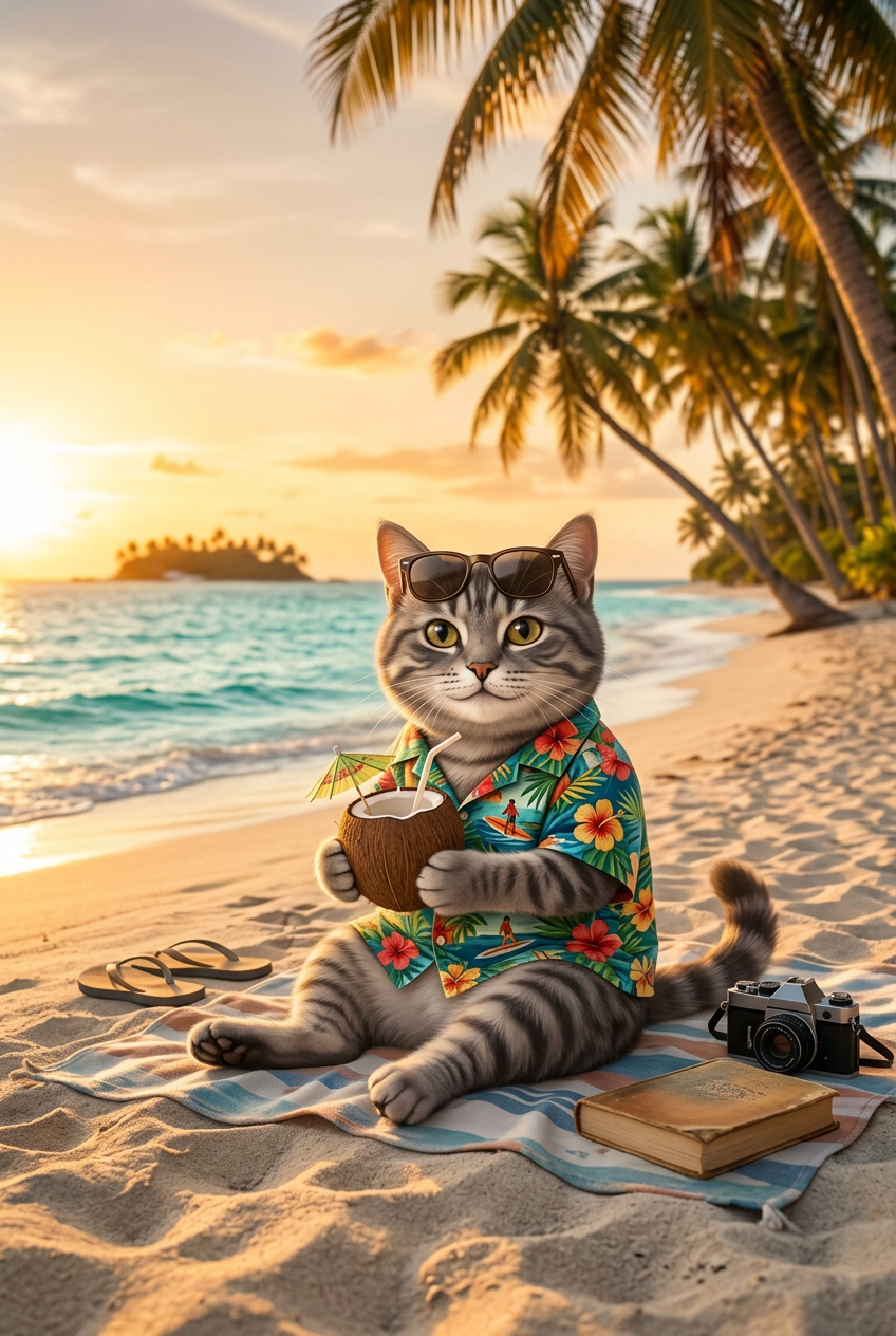 An anthropomorphic gray cat character at a sunny beach in a tropical setting, wearing a casual summer outfit with a colorful Hawaiian shirt and sunglasses, relaxed vacation vibe, palm trees and ocean in background, golden hour sunset lighting