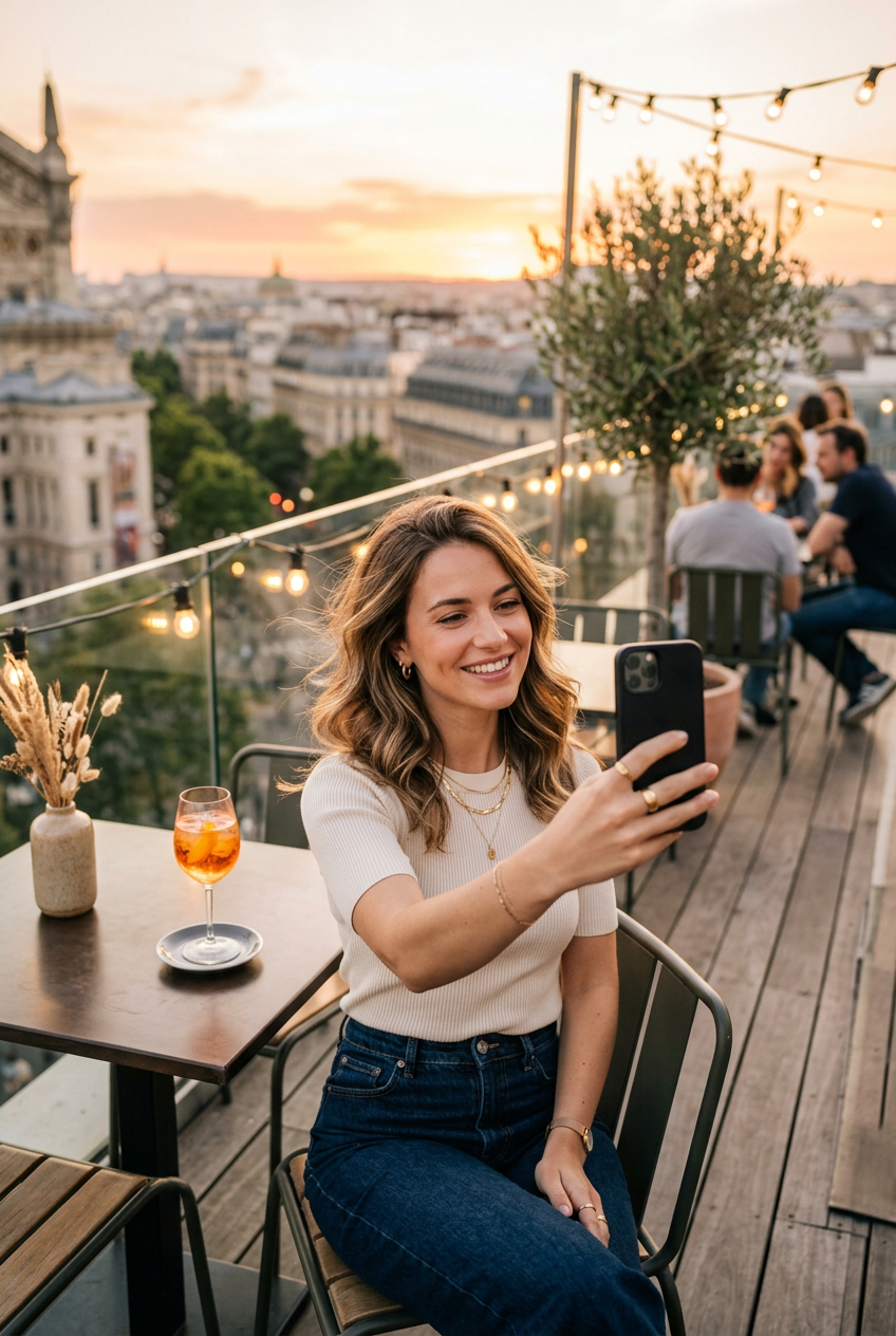Stylish woman in her 20s taking a selfie at a rooftop cafe during golden hour, warm sunset lighting, minimalist aesthetic, modern fashion, clean composition, professional photography, soft natural light, casual elegant vibe