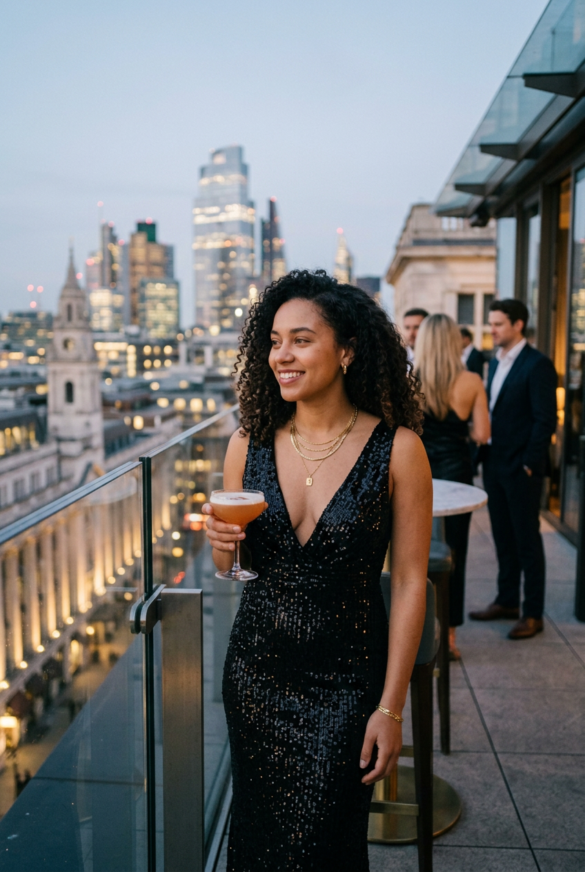 Young woman with curly dark hair in a chic black evening gown, standing at an elegant rooftop bar or lounge with city lights and modern architecture in background