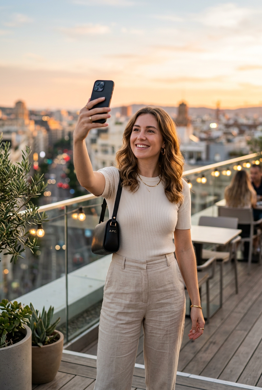 Stylish woman in her 20s taking a selfie at a rooftop cafe during golden hour, warm sunset lighting, minimalist aesthetic, clean composition, modern fashion, soft bokeh background, high quality portrait