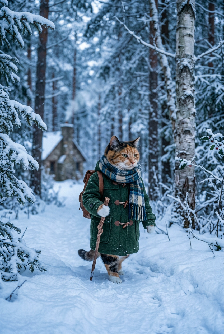 An anthropomorphic calico cat wearing cozy winter clothing - wool coat and scarf - walking through a snow-covered forest with pine trees and winter scenery, cool blue lighting, serene winter mood, lifestyle photography
