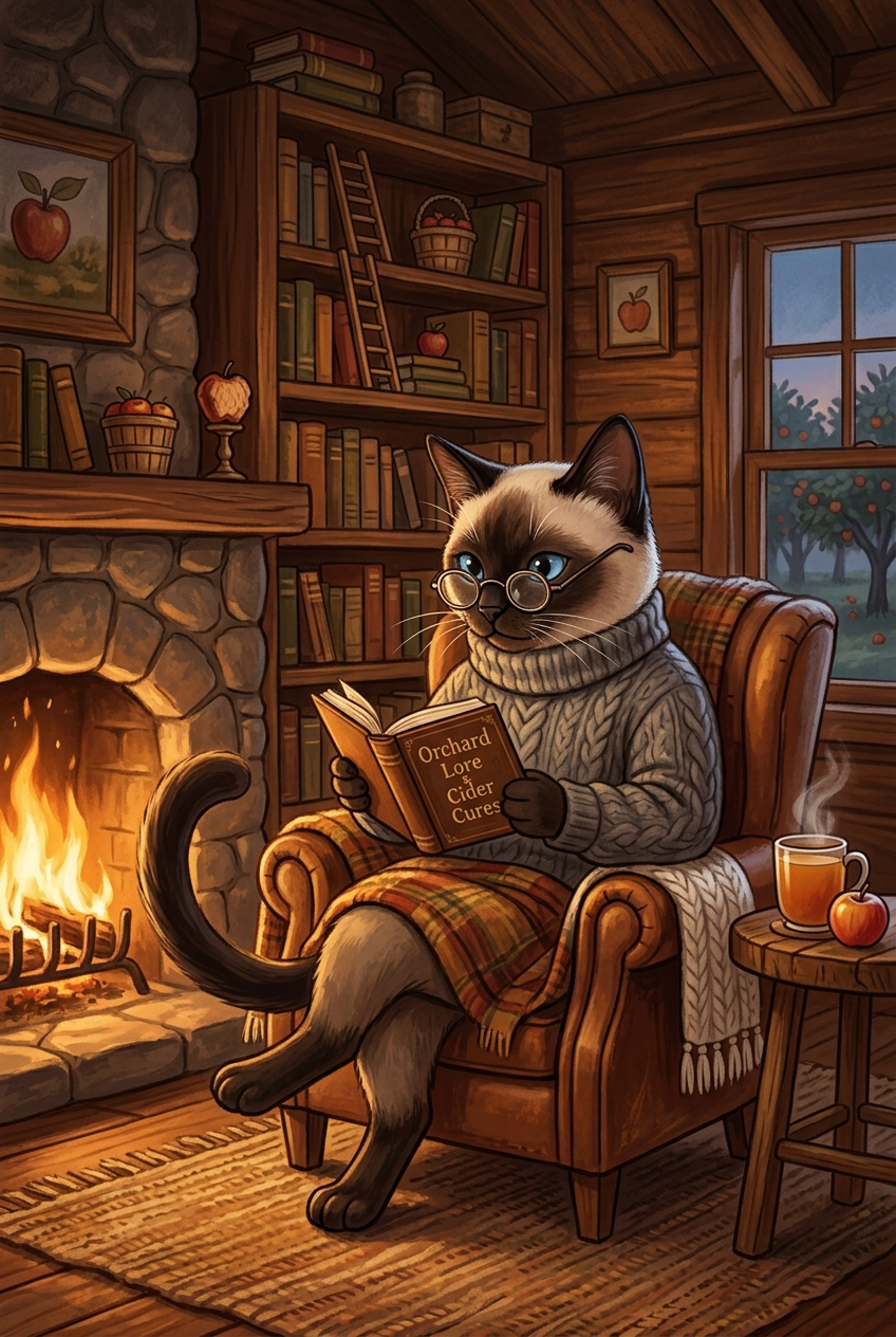 Siamese cat anthropomorphic character in a cozy cabin interior, wearing casual sweater and reading glasses, sitting by a fireplace with warm ambient lighting, wooden cabin decor with bookshelves and warm color palette, comfortable home aesthetic, charming illustration style