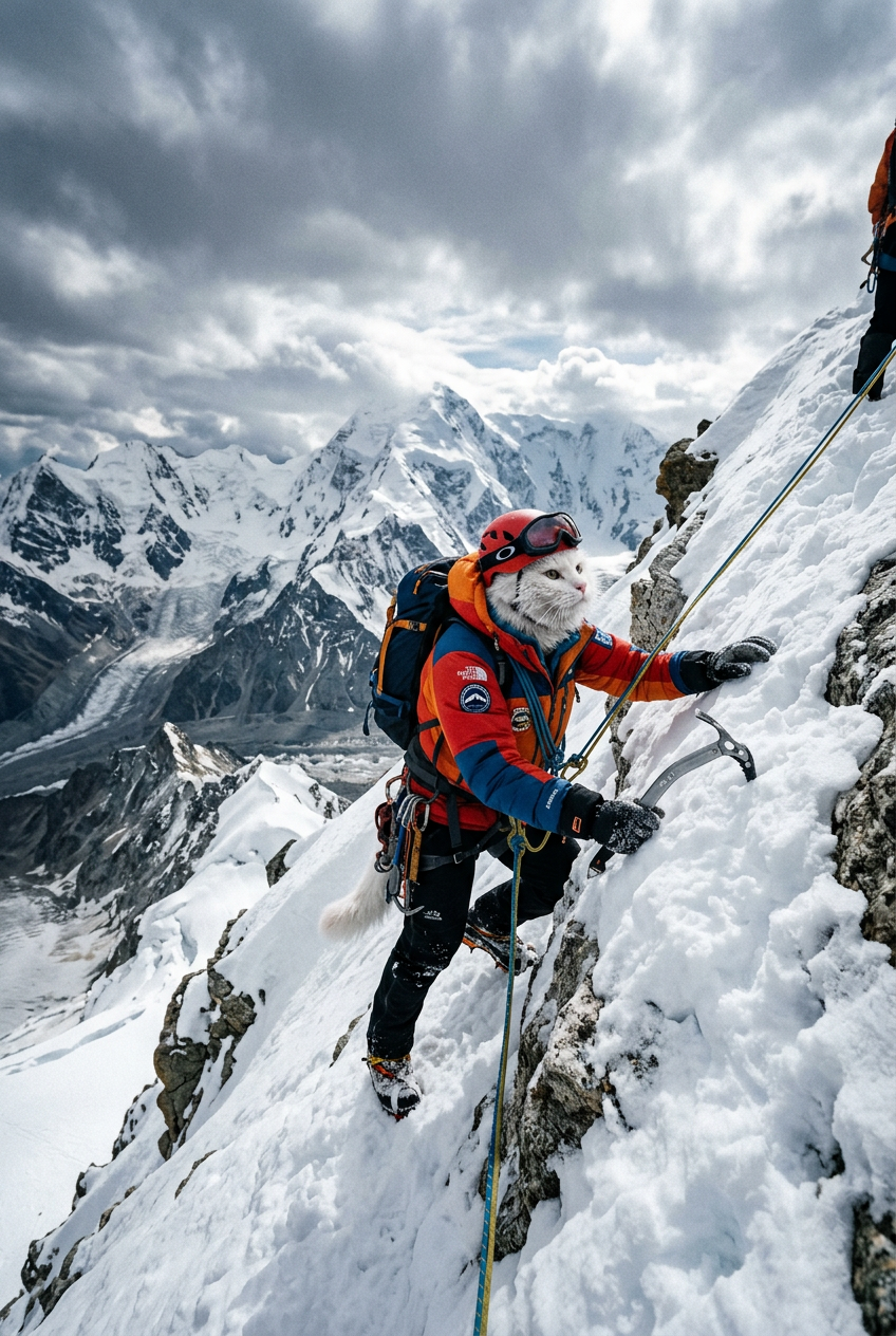 An anthropomorphic white cat in mountain climber outfit (climbing harness, ice axe, thermal jacket, goggles) scaling a snow-covered peak with dramatic alpine scenery and cloudy sky, adventure photography style, cinematic lighting