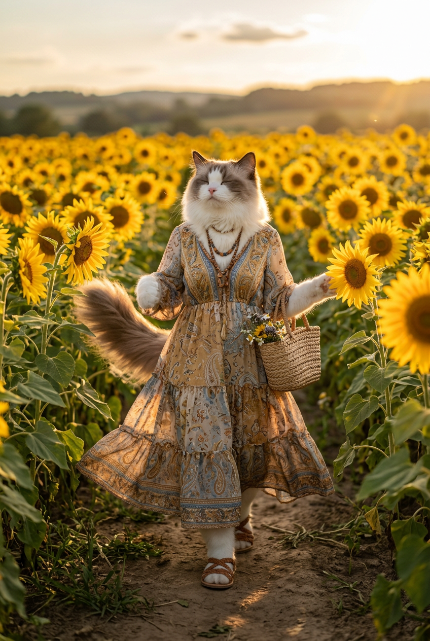 An anthropomorphic ragdoll cat in bohemian summer dress, walking through a sunflower field at golden hour, peaceful and carefree expression, nature photography, flowing fabric