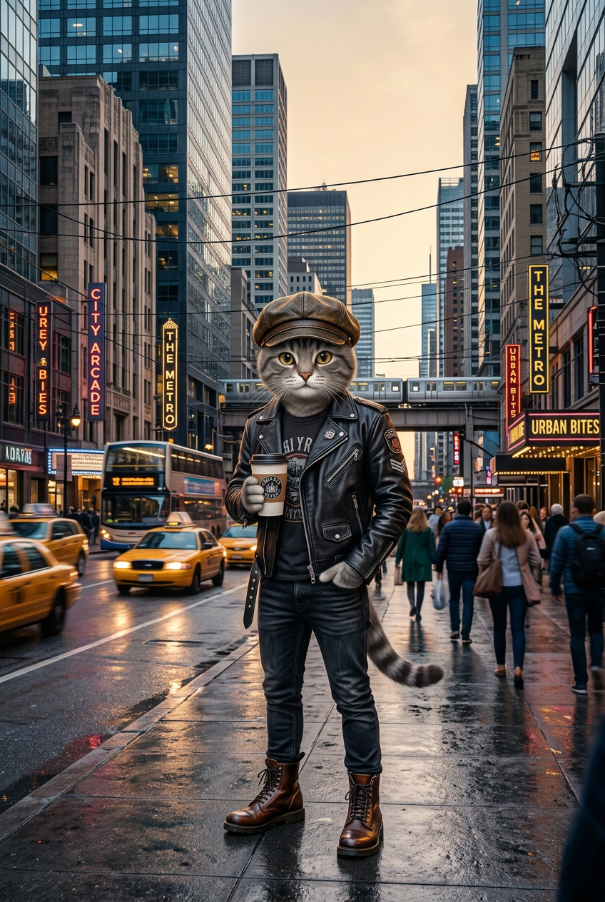 An anthropomorphic gray cat character in a bustling city street, wearing trendy urban outfit with leather jacket and stylish boots, surrounded by modern buildings and city lights, cosmopolitan nightlife atmosphere, contemporary fashion