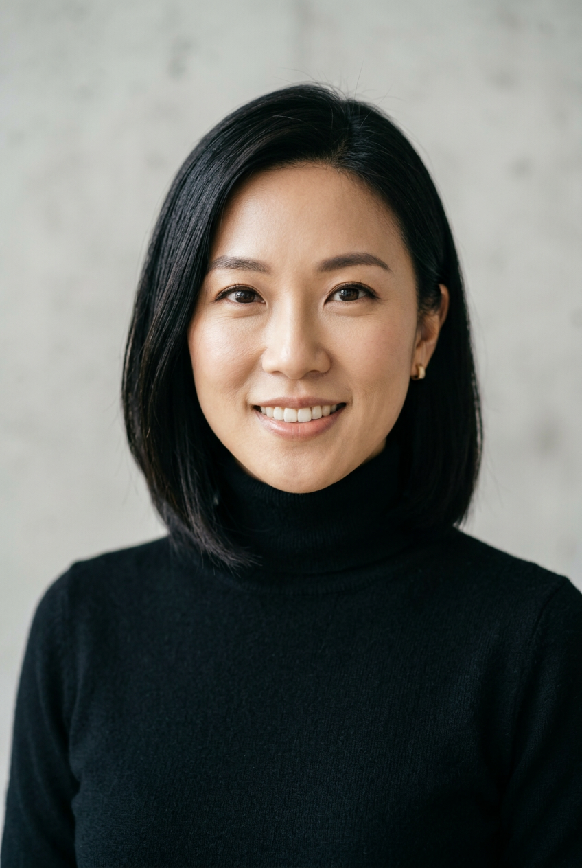Close-up professional portrait of Asian woman, face and shoulders, soft natural lighting, luxury aesthetic. Background: light gray concrete wall, wearing black turtleneck, minimalist setting, high-end fashion photography, same facial features as reference, confident expression