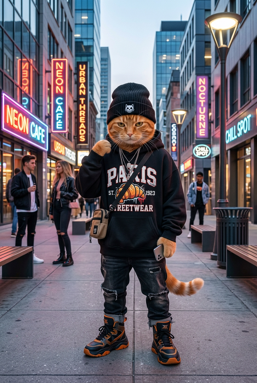 Anthropomorphic orange cat in a trendy streetwear outfit with a beanie and oversized sweater, posing in a modern city street with neon signs, urban lifestyle fashion photography