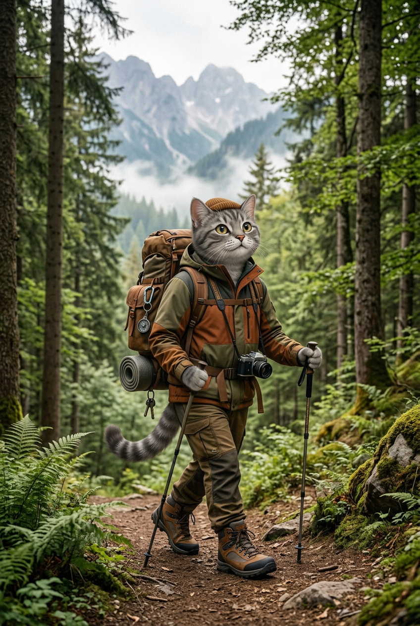 An anthropomorphic gray cat character hiking in a lush forest with towering trees, wearing outdoor adventure gear with hiking boots and backpack, misty mountain landscape, nature exploration vibe, daytime forest lighting