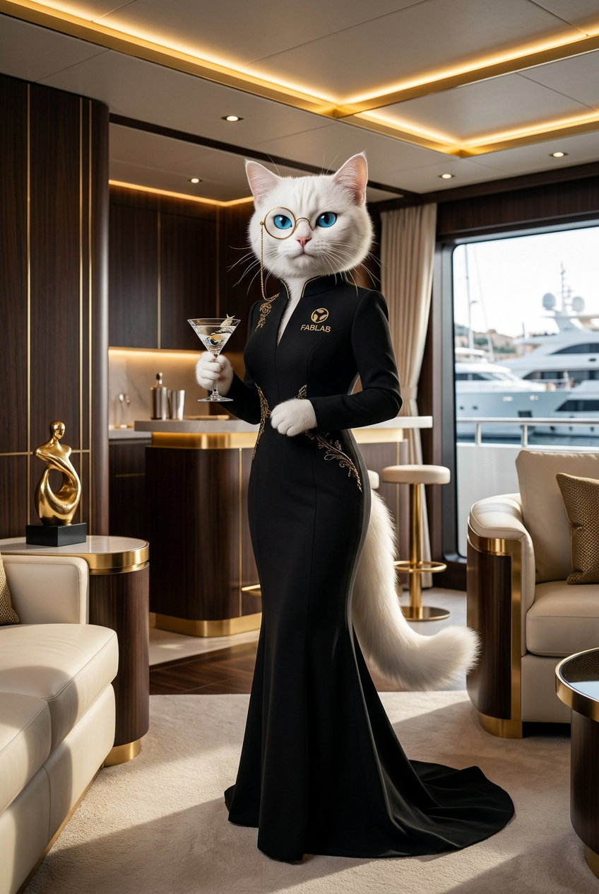 anthropomorphic white cat wearing elegant black evening gown, standing in luxury yacht interior, gold accents, modern minimalist design, sophisticated lighting, high fashion portrait