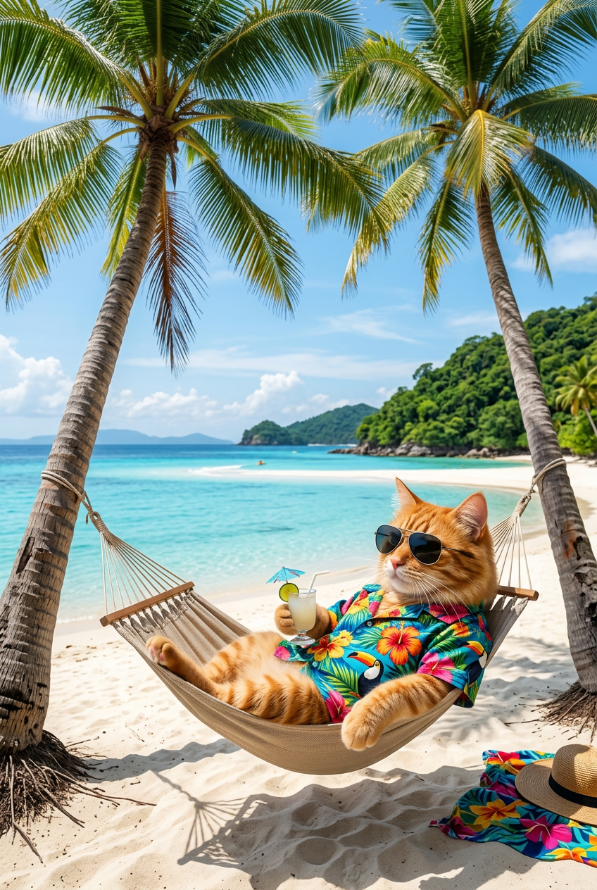 An anthropomorphic ginger cat in a tropical beach outfit with sunglasses and floral shirt, lounging on white sand with turquoise ocean and palm trees, sunny tropical paradise setting, professional travel photography