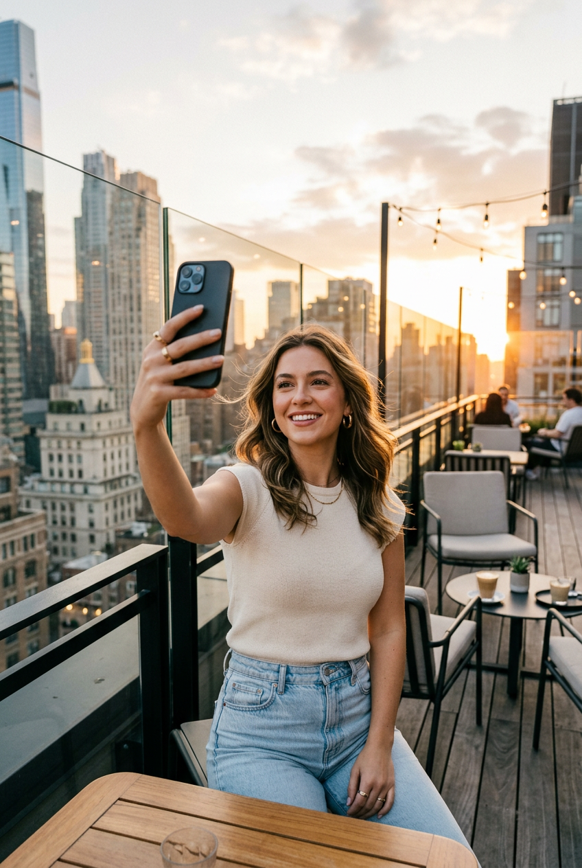 stylish woman in her 20s taking a selfie at a rooftop cafe during golden hour, warm sunset lighting, minimalist aesthetic, clean composition, modern fashion, confident pose, soft natural light, urban rooftop setting with city views