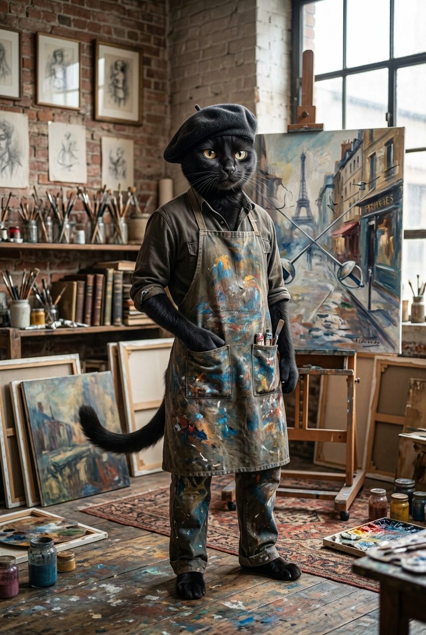 Anthropomorphic black cat in sleek artist's studio with paint-splattered apron and beret, surrounded by canvas and art supplies, creative bohemian vibe, confident pose