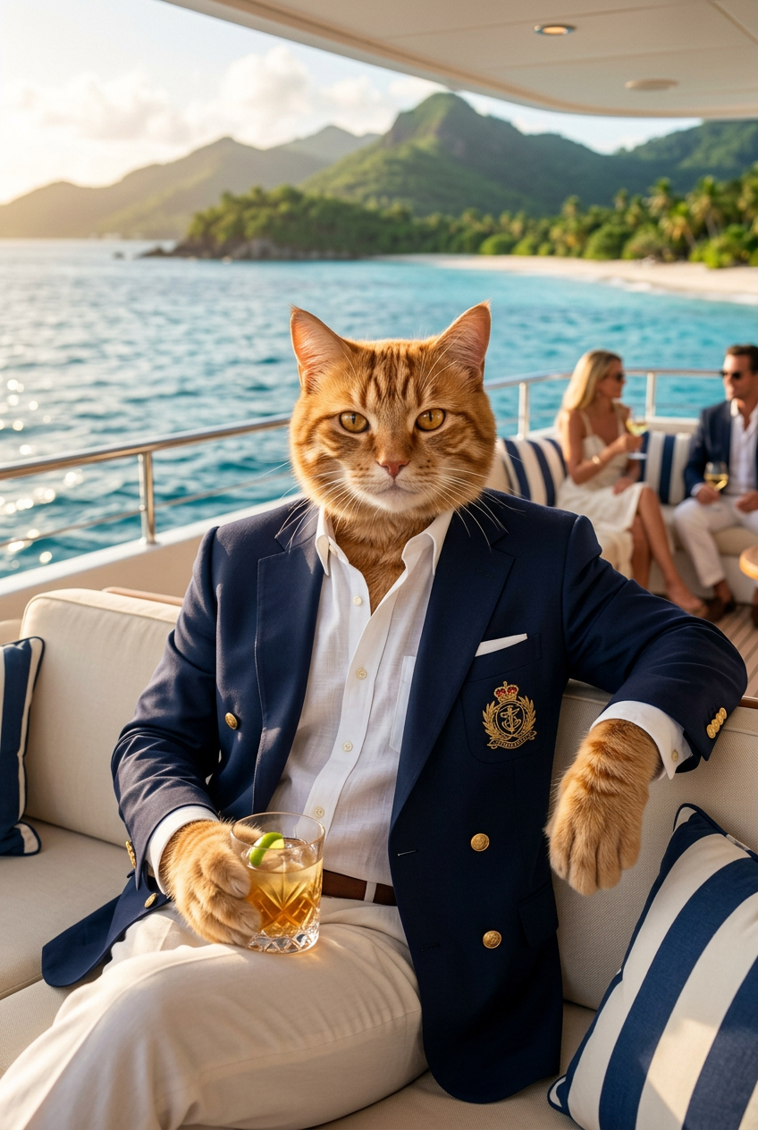 Anthropomorphic ginger cat wearing elegant yacht club blazer and white linen, relaxing on a luxury yacht deck, ocean backdrop, tropical island vibe, high fashion photoshoot style