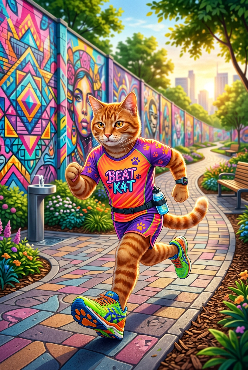 Orange cat wearing athletic sporty outfit and sneakers, running through a vibrant urban park with colorful street art walls